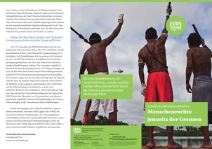 Viele Verletzungen von wirtschaftlichen, sozialen und kulturellen Rechten haben ihren Ursprung weit entfernt von dem Ort, an dem sie stattfinden. Universalität ist ein Grundprinzip der Menschenrechte. Dennoch interpretieren viele Staaten ihre menschenrechtlichen Verpflichtungen ausschließlich auf ihr eigenes Territorium beschränkt. In unserem neuen Infofolder werden die sogenannten Extraterritorialen Staatenpflichten (ETOs) und damit die menschenrechtlichen Verpflichtungen von Staaten gegenüber Menschen in anderen Ländern beschrieben.
