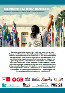 Zwischenstaatliche Abkommen erleichtern Konzernen den Zugang zu Märkten und Rohstoffen und schützen ihre Interessen mit einklagbaren Rechten. Für den Schutz der Menschenrechte bei weltweiten Unternehmensaktivitäten gibt es jedoch bloß freiwillige Leitprinzipien, deren Anerkennung den Staaten wie global agierenden Unternehmen derzeit bloß „empfohlen“ wird. Bei Verstößen haben die Opfer praktisch keine Chance auf Entschädigung und Wiedergutmachung, die Unternehmen bleiben straflos. Das muss sich ändern! Menschenrechte müssen effektiv geschützt werden. Dafür braucht es ein verbindliches Abkommen, in dem die Weltgemeinschaft Unternehmen zur Einhaltung von Menschenrechten verpflichtet.